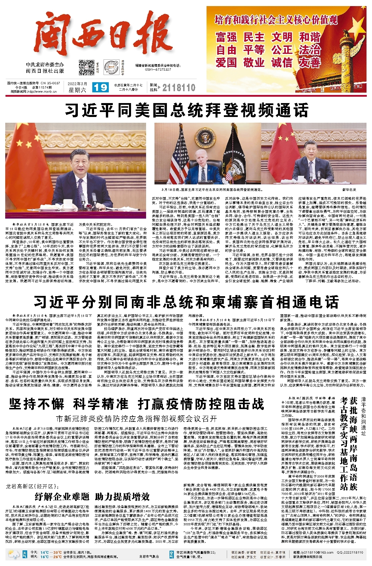 本报讯(记者 石芳)18日晚,市新冠肺炎疫情防控应急指挥部视频会议召开,认真学习贯彻习近平总书记在17日中共中央政治局常务委员会会议上的重要讲话精神,落实18日上午省应对新冠肺炎疫情工作领导小组会议部署要求,会商部署全市疫情防控工作。市委副书记、市长、市疫情防控应急指挥部总指挥胡盛出席会议并讲话,市领导黄立峰、陈厦生、修洪,省派驻龙岩疫情防控与医疗救治工作组组长龚凌参加。