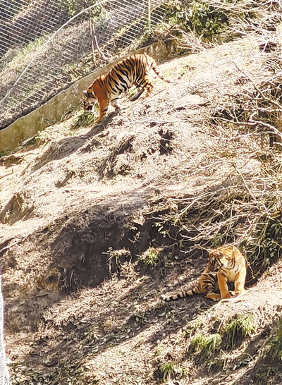 在华南虎栖息地,老虎正懒散地或坐或躺,晒着太阳,甚是惬意。