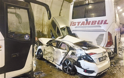 这是3月19日拍摄的土耳其西北部博卢省一隧道的交通事故现场。博卢省一隧道当日发生多辆汽车连环相撞事故,造成数十人受伤。据报道,事故发生在博卢省的博卢山隧道,波及18辆轿车、卡车、半挂车和城际客车,导致隧道交通一度中断。