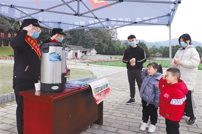 女警巡逻服务队在古田会议会址为游客提供便民茶水。