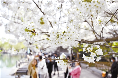 3月23日,在济南市环城公园,人们在欣赏绽放的樱花。近日,泉城济南各大公园内的樱花纷纷绽放,吸引不少市民驻足观赏。新华社记者 徐速绘 摄