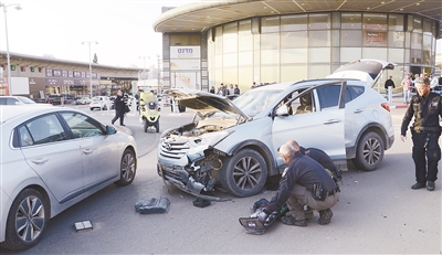 这是3月22日在以色列贝尔谢巴的袭击现场拍摄的受损车辆。以色列警方22日说,该国南部城市贝尔谢巴当天发生一起袭击事件,造成4人死亡、2人受伤。 新华社 发