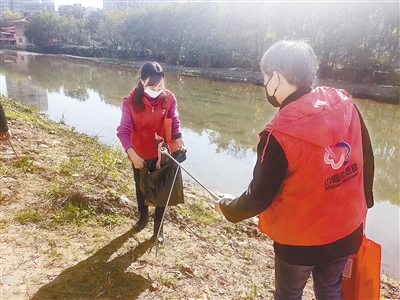 近日,新罗区南城街道小溪社区新时代文明实践站、妇联共同开展“巾帼护河我先行”志愿服务活动。活动中,志愿者们对沿岸的垃圾、杂草等进行清理,并向路过的居民发放相关宣传材料,倡导居民爱护环境、保护水源。图为志愿者们正在清理垃圾。 记者 罗玉文 通讯员 林利琴 摄