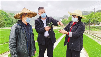 为确保完成全年的粮食安全生产任务,永定区涉农部门全力以赴打好粮食生产第一仗,截至25日,全区共安排粮食播种目标任务24万亩。种植大户陈安娣今年在该区金砂镇流转了160多亩土地用于种植富硒大米,部分农田采取稻鱼模式,发展水稻观光农业。图为农业技术人员指导陈安娣(右一)秧苗病虫害防治的场景。 记者 郭亦斌 通讯员 熊川 摄