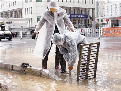 26日凌晨开始,永定区出现持续强降雨,导致城区部分路段积水、内涝严重。当地立刻启动应急预案,采取积极措施应对,预防次生灾害。图为防汛应急人员正在进行巡查疏通,确保排水顺畅,保障通行安全。