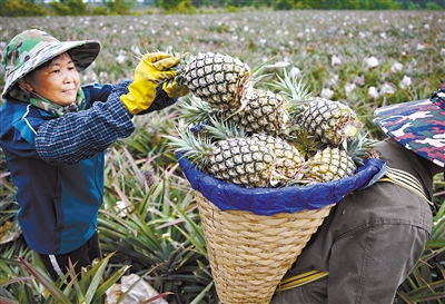 3月27日,工人在文昌市东阁镇田间采摘凤梨。时值春日,在祖国南端的海南文昌市农田里,板栗、地瓜、凤梨迎来丰收,人们忙着采摘、挑拣、装箱,田间地头一片繁忙景象。新华社记者 郭程 摄