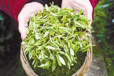 3月27日,在杭州西湖区的西湖龙井一级保护区的茶园里拍摄到的刚采摘的西湖龙井明前茶嫩芽。清明临近,各地茶场进入明前茶采摘的忙碌时期,茶农抓紧时间采摘、加工、制作新茶,供应市场。 新华社 发