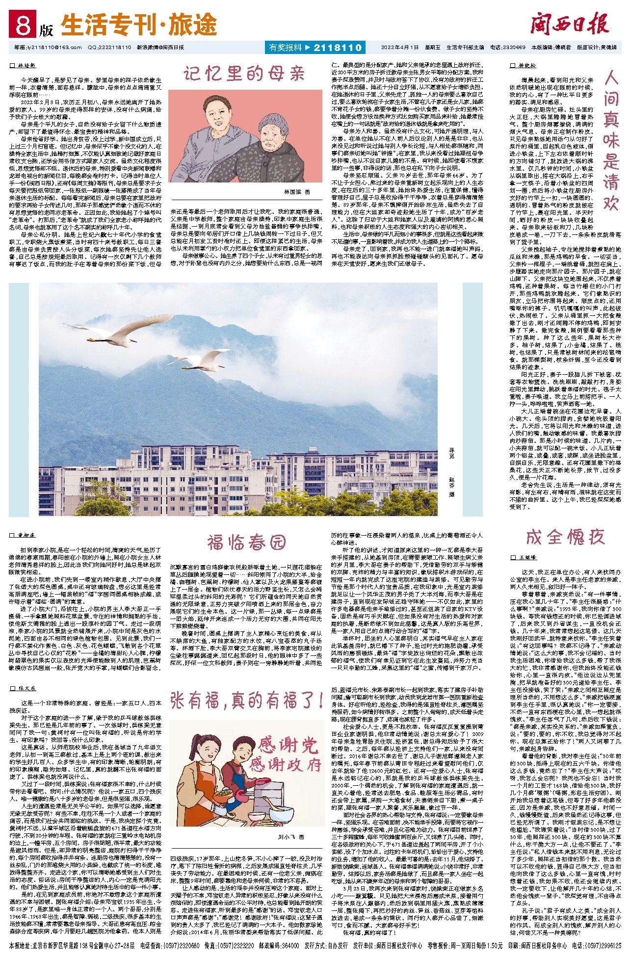母亲俭省好学。她出身贫苦,没上过学,新中国成立后,只上过三个月扫盲班。但记忆中,母亲似乎不像个没文化的人,在操持全家生活中,她精打细算,不仅能认真细致地记载好家庭日常收支台账,还学会用书信方式跟家人交流。虽然文化程度很低,思想觉悟却不低。退休后的母亲,特别爱看中央新闻联播和龙岩电视台的新闻栏目,每晚都会准时打卡。记得当时单位人手一份《闽西日报》,还有《每周文摘》等报刊,母亲总是要求子女每天要把报纸带回家,一张报纸一副眼镜一张藤椅成了当年母亲退休生活的标配。每每看完新闻后,母亲总要在家里把政府的要求再给子女传述几句,那样子那感觉俨然像个退而不休的有思想觉悟的老同志老革命。正因如此,我给她起了个绰号叫“老革命”。打那后,“老革命”就成了我们全家老小称呼她的代名词,母亲也就享用了这个名不副实的称呼几十年。