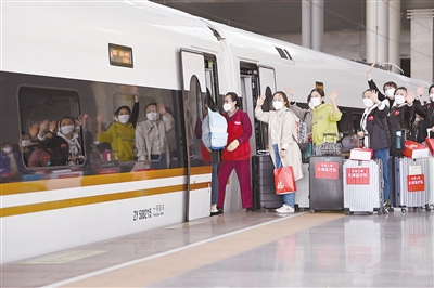 4月3日,天津援沪医疗队员在天津西站登车时向送行人员挥手告别。当日,天津援沪医疗队乘坐高铁列车从天津西站出发,赶赴1000公里外的上海支援当地疫情防控工作。据了解,此次援沪医疗队派出约1500名医护人员,分别来自天津医科大学总医院、天津市第一中心医院等35个医疗机构。 新华社记者 李然 摄
