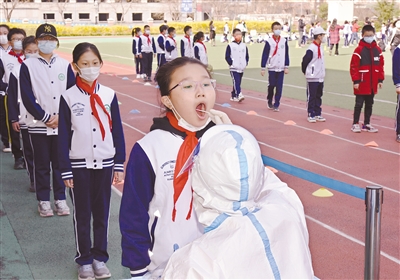 4月10日,医务人员为青岛立新小学学生进行核酸采样。当日,山东青岛部分学校组织师生进行核酸采样工作,为恢复线下教学做准备。