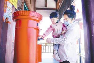 游客在初心邮局邮寄明信片。
