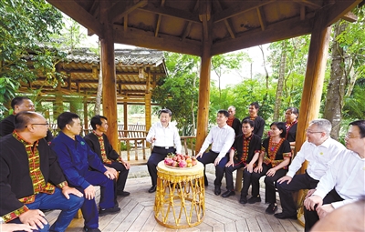 这是11日下午,习近平在五指山市水满乡毛纳村,同当地干部群众亲切交谈。 新华社记者 李学仁 摄