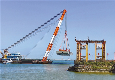 4月10日,由中铁大桥局施工的南(广州南沙)中(中山)高速公路控制性工程洪奇门特大桥主桥开始架设钢箱梁,全桥钢箱梁总长1126米,共计77段块。 (人民网)