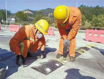 为创造安全、畅通、舒适的高速公路行车环境,“五一”期间,永定湖雷公路养护站职工放弃休息,切实加强高速公路养护管理。图为养护工对破损的减速带进行维护加固。 通讯员 李荣龙 摄