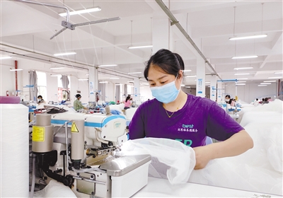 7日,记者在位于新罗区雁石镇的福建亚合工贸有限公司生产车间看到,工人们正在马不停蹄地赶制订单产品。该公司目前已招募250余名工人,带动周边居民充分就业,每月产值达2000多万元。图为工人正在进行蚊帐锁边作业。