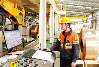 今年以来,上杭县重点产业发展势头良好,其中,第一季度该县规模以上金铜企业实现产值340.6亿元,增长24.43%。图为5月9日,位于上杭工业区的福建紫金铜业有限公司高性能铜合金带箔技术改造项目,工人正在清洗线控制平台上作业。