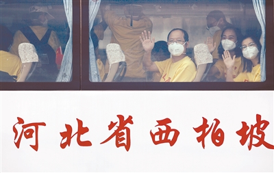 5月14日,在石家庄正定国际机场,河北省援沪医疗队队员在大巴上挥手致意。