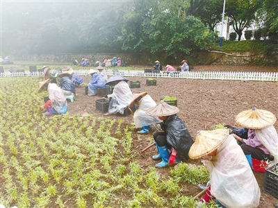 近日,在中心城区小溪河畔,一群“城市绣花女”正在雨中种马鞭草。据了解,这60多位种花女,多数是新罗区龙门、小池、赤水一带的农民,她们固定受雇于某园林公司,常年都有活干,每天120多元,自带午饭,乘公交车到城里打工,每天工作8小时,风雨无阻。图为她们正在种马鞭草。 詹鄞森 摄