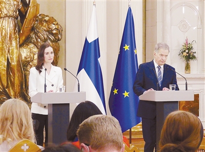 5月15日,在芬兰赫尔辛基,芬兰总统尼尼斯托(右)和总理马林参加联合记者会。