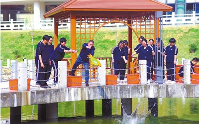日前,上杭县紫金中学开展环保教育活动,在新校园的湖里,放养了1000多尾鱼苗,通过鱼苗放养,让全体师生接受一场亲近自然、爱护生态环境的教育。图为师生在放养鱼苗。