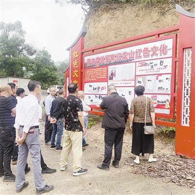 长汀县四都镇归龙山位于汀江源国家级自然保护区核心区内。近年来,镇里组织有关部门在此打造生态和客家民俗活动游过程中,又植入红色元素。图为22日游客在阅看红色文化栏。