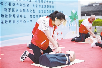 5月27日,由市教育局、河长办、红十字会联合主办,主题为“有效预防溺水 共筑生命防线”2022年龙岩市预防学生溺水联防联控宣传教育活动在新罗区白沙镇举办。活动现场,白沙中心小学师生、家长代表,白沙镇、村级河长及河道专管员代表等一起观看了心肺复苏展演、水上救援演练,认真听取水上安全及自救知识授课,将“安全第一,生命至上”的理念融入心中。图为市红十字应急救护培训中心人员演示心肺复苏抢救。 融媒体记者 蓝明丰 摄