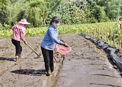 近日,永定区龙潭镇枫林村村民郑桂凤在播撒烟后稻种。永定区烟草部门积极推行“大户+小户”协调发展的模式,较好地解决了小户分散种植与资源高效、集约生产不相适应的问题。据了解,今年永定区将种植烟后稻4.02万亩,产量达到4824万斤以上,既鼓起农民的钱袋子,又抓牢农民的粮袋子。