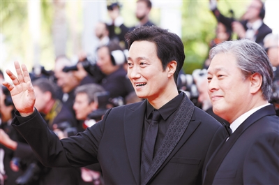 5月28日,在法国戛纳举行的第75届戛纳国际电影节上,《分手的决心》导演朴赞郁(右)、演员朴海日踏上闭幕式红毯。第75届法国戛纳国际电影节28日闭幕。 新华社记者 高静 摄