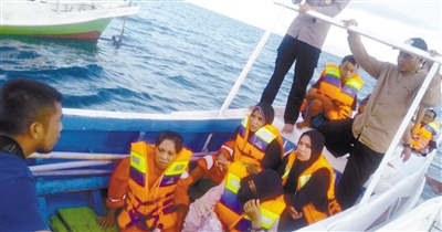 这张印度尼西亚国家搜救局提供的照片显示,5月28日,部分落水人员在南苏拉威西省附近海域获救。印度尼西亚搜救人员28日证实,印尼南苏拉威西省附近海域日前发生一起渡轮倾覆事故,一艘载有42人的渡轮在从该省首府望加锡前往庞卡杰内和群岛县的途中发生倾覆,船上人员全部落水。过往船只成功救起17人,其余25人失踪。
