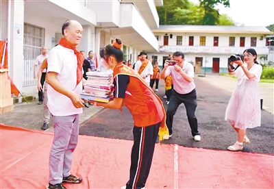 昨天,30多名厦门知青和爱心人士共聚上杭县溪口镇大洋坝小学,开展“大手牵小手,爱心接力情”活动,和孩子们共庆“六一”儿童节,知青代表刘黎晖将爱心捐款4万余元和书籍等爱心礼物交付给学校。知青们还进行了书法现场演示、唱歌技巧、乒乓球现场教学等课外兴趣小组活动,为孩子们传授技艺。图为捐赠仪式现场。 融媒体记者 傅长盛 摄