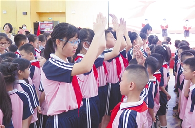 6月1日,龙岩师范附属小学举行“喜迎二十大,争做新时代好少年”一年级首批新队员入队仪式暨“六一”表彰大会,活动增强了新队员的光荣感和组织归属感,激励大家成为新时代的好少年。图为四年级的老队员们为新队员们佩戴红领巾。 通讯员 林宗美 许雪花 摄