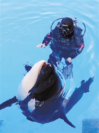 5月31日,在上海海昌海洋公园,保育员与小虎鲸一起在水中玩耍互动。6月1日,上海海昌海洋公园宣布,公园已成功繁育一只雄性虎鲸幼崽,经过保育团队的悉心照料,小家伙现已度过安全观察期,状态良好。公园计划择期让小虎鲸与游客正式见面。 新华社记者 方喆 摄