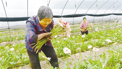 两位年已花甲的村民正在大棚内修剪非洲菊花卉枝叶。她俩笑呵呵地告诉笔者:“自从加入合作社,每天有110-130元的收入,我们的零花钱再也不用找后辈要了。”