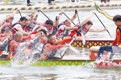 6月3日,俄罗斯队(上)在公开组男子竞技龙舟200米决赛中。