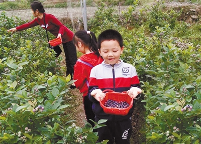 近日,在连城县揭乐乡官峰村一家山场果园,游人在乐采蓝莓。官峰村不仅有90多亩鱼塘引来众多垂钓爱好者,各种水果园也成了城区市民家庭近郊生态游的乐园。