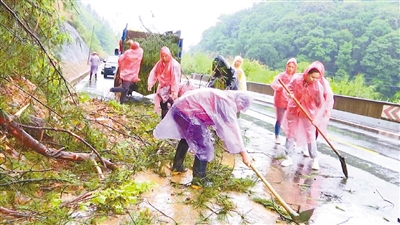 6月8日,在永定区坎市镇坎湖路清溪段,一处山体因吸水饱和,造成了垮塌,坎市镇党委政府迅速组织党员干部和各部门志愿者赶到现场开展险情处置工作,立即对该路段进行了警戒,并综合考虑塌方量和路宽等因素,有序开展路面淤泥砂石清障工作,恢复道路畅通。图为清障现场。 通讯员 黄秋萍 摄
