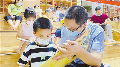 19日,在永定区新华书店阅读区,一位父亲正陪伴孩子读书。当日是父亲节,在永定区新华书店,不少家长带着孩子到这里参加亲子阅读,陪伴孩子在书的海洋中汲取知识,助力孩子健康成长。
