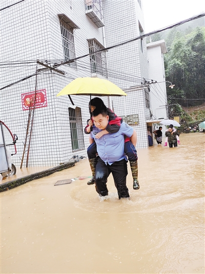 长汀县公安局城关派出所民警洪水中转移受困群众。