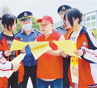 近日,永定公路中心邀请电视剧《绝密使命》中饰演小卖部掌柜的演员赖晓生(左三)到湖坑中学,宣传文明出行和公路安全。连日来,该中心组织人员走进中小学,开展“文明出行 爱路护路”公路安全宣传教育,为学生普及公路安全知识。