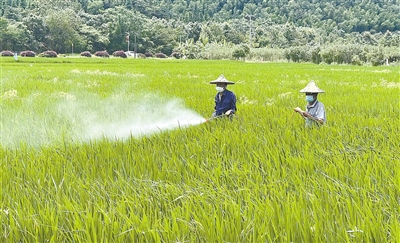 水稻破口期是病虫害易发高发期,也是防治病虫害的最佳时期。22日上午,笔者在新罗区雁石镇厦中村“福香占”绿色栽培集成示范田看到,农民正在田间喷洒复合微生物菌肥和病虫害防治药物,防治当前水稻易生的稻纵卷叶螟、稻飞虱、纹枯病等病虫害,确保后期增产增收。 通讯员 温连光 章辰汶 摄