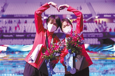 6月27日,陈芋汐(左)与全红婵在颁奖仪式后合影。当日,在匈牙利首都布达佩斯举行的2022年世界游泳锦标赛跳水项目女子十米台决赛中,中国选手陈芋汐、全红婵包揽冠亚军。 新华社记者 郑焕松 摄