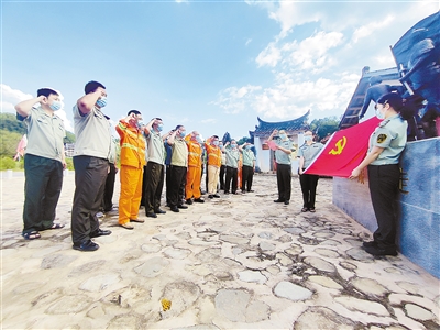 7月1日,龙岩高速公路永定、上杭、武平三个片区党支部联合组织开展“坚决维护核心 践行初心使命”庆“七一”主题党日活动。图为全体党员在永定暴动遗址金谷寺重温入党誓词。