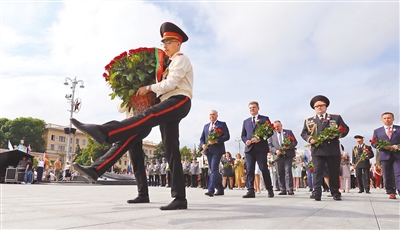 7月3日,人们在白俄罗斯明斯克胜利广场向胜利纪念碑献花。白俄罗斯3日举行活动,纪念国家独立日暨二战中从德国法西斯占领下解放78周年。 新华社 发