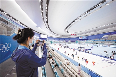 7月9日,在国家速滑馆,一名参观者拍摄游客进行滑冰体验。当日,北京冬奥会标志性场馆国家速滑馆(“冰丝带”)正式对外开放。国家速滑馆先期开放约6000平方米冰面供公众滑行,公众可近距离接触体验北京冬奥会“最快的冰”。