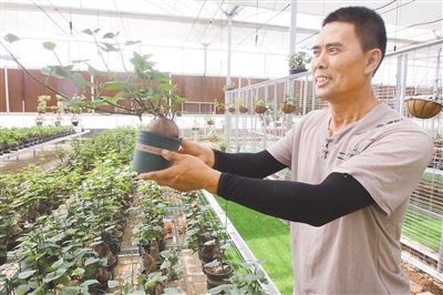图为农业技术人员展示“地中宝”地瓜种苗盆景。