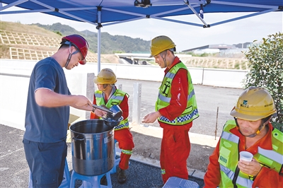 7月14日,在临建高速土建一标项目现场,工作人员为施工人员盛银耳汤消暑。