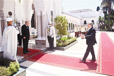 7月18日,阿尔及利亚总统特本在首都阿尔及尔欢迎到访的意大利总理德拉吉(右)。阿尔及利亚总统特本18日在首都阿尔及尔会见到访的意大利总理德拉吉。特本在联合记者会上说,阿方19日将与美国西方石油公司、法国道达尔能源公司、意大利埃尼公司等能源公司签署一项总额为40亿美元的协议。通过该协议,阿尔及利亚将向意大利输送“非常多”的天然气。 新华社 发