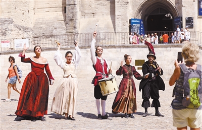 7月19日,在法国南部城市阿维尼翁,演员身着戏服在教皇宫前推介自己的剧目。第76届阿维尼翁戏剧节于7月12日至26日举行。阿维尼翁戏剧节创立于1947年,以其丰富多元的剧目和高水准的演出,成为世界上最为著名的戏剧艺术节之一。新华社记者 高静 摄