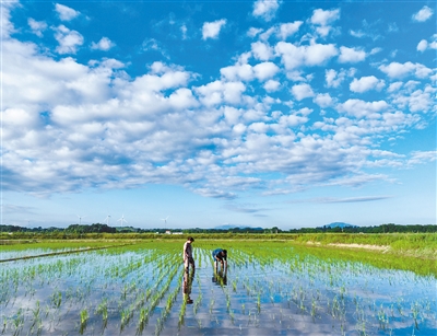 7月22日,农户在湖南省永州市道县蚣坝镇洲背村虾田里补植晚稻秧苗(无人机照片)。 大暑节气将至,全国各地农民抢抓农时在田间劳作,一派繁忙景象。 新华社发(蒋克青 摄)