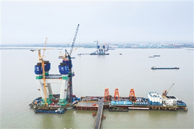 7月26日,常泰长江大桥工程正在施工中。正在建设中的常泰长江大桥连接江苏省常州市与泰州市,全长10.03公里,桥梁采用上下层布置,上层桥面为双向6车道高速公路,设计时速100公里,下层桥面为设计时速200公里的两线城际铁路与设计时速80公里的普通公路,是集高速公路、城际铁路与普通公路“三位一体”的跨江大桥。 新华社记者 杨磊 摄